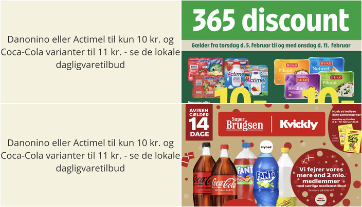 Coop365 tilbyder Danonino eller Actimel til en pris på kun 10 kr. pr. stk. med en vægt på 300-400 g. Dette tilbud er gyldigt fra torsdag den 5. februar til onsdag den 11. februar.